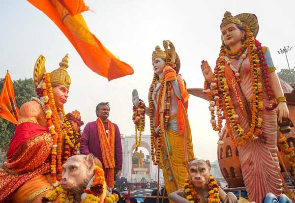 அயோத்தியில் ராமர் கோயில் கும்பாபிஷேக விழாவையொட்டி ம.பி.யிலிருந்து வாகனத்தில் சென்ற ராமர் ,சீதை, ஹனுமன் சிலைகள் இடம்: லக்னோ.