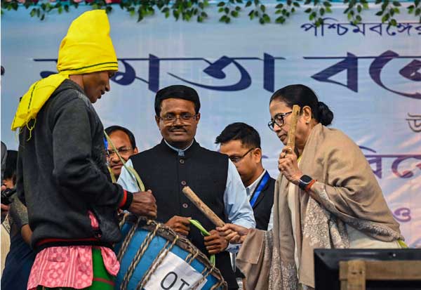 மேற்கு வங்க முதல்வர் மம்தா பானர்ஜி, புர்த்வான் மாவட்டத்தில் நடந்த நிகழ்ச்சியில் டிரம்ஸ் வாசித்தார்.