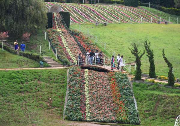 ஊட்டி பர்ன்ஹில் பகுதியிலுள்ள, கர்நாடக தோட்ட கலைத்துறை பூங்காவில், மலர் நீர்விழ்ச்சியை ரசித்து செல்லும் சுற்றுலா பயணிகள்.