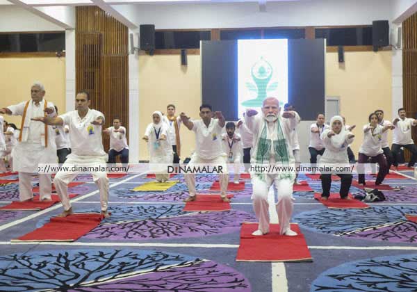 சர்வதேச யோகா தினத்தை முன்னிட்டு காஷ்மீரில் நடந்த நிகழ்ச்சியில் பிரதமர் மோடி யோகா செய்தார்.