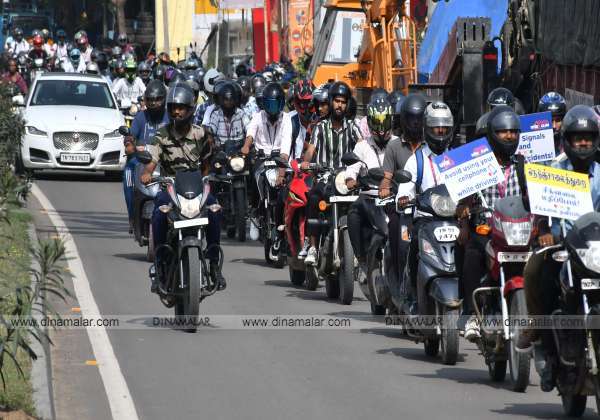 சாலை பாதுகாப்பு மற்றும் ஹெல்மெட் அணிவது குறித்து விழிப்புணர்வு இருசக்கர வாகன பேரணி மேற்கொண்ட கோவை ஈச்சனாரி ரத்தினம் கல்லூரி மாணவர்கள். இடம்: பொள்ளாச்சி மெயின் ரோடு.