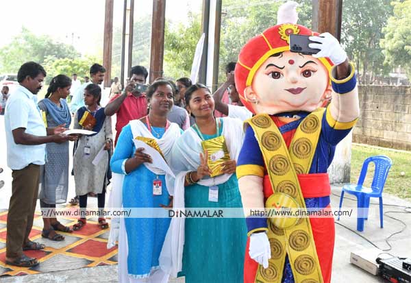 திருவண்ணாமலை மாவட்ட விளையாட்டு அரங்கில், கேலோ இந்தியா விளையாட்டுப் போட்டி குறித்து நடந்த விழிப்புணர்வு போட்டியில், பரிசு வென்ற மாணவிகள் செல்பி எடுத்துக் கொண்ட கேலோ இந்தியா பொம்மை வேடம் அணிந்த நபர்.