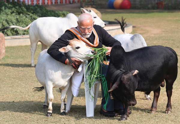 மகர சங்கராந்தியை முன்னிட்டு, பிரதமர் மோடி தனது வீட்டில் பசுக்களுக்கு உணவு அளித்தார். இடம்: புதுடில்லி.