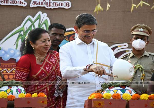 சென்னை கவர்னர் மாளிகையில் நடைபெற்ற பொங்கல் விழாவில் கலந்துகொண்டு பொங்கல் வைத்து கொண்டாடிய கவர்னர் ரவி மற்றும் அவரது மனைவி லட்சுமி ரவி.இடம்: கிண்டி