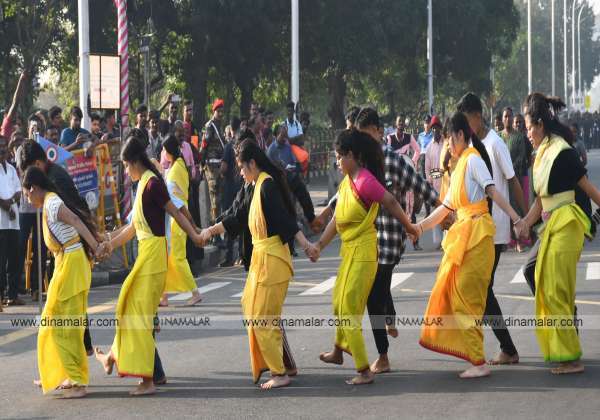 குடியரசு தினத்தை முன்னிட்டு கலை நிகழ்ச்சிகள் ஒத்திகை நடந்தது. இடம்: சென்னை மெரினா காமராஜர் சாலை.