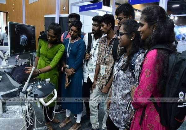 சென்னை நந்தம்பாக்கம் வர்த்தகமையத்தில் கருணாநிதி நூற்றாண்டு பன்னாட்டு மருத்துவ மாநாடு மற்றும் கண்காட்சியை பார்வையிட்ட மருத்துவ கல்லூரி மாணவர்கள்