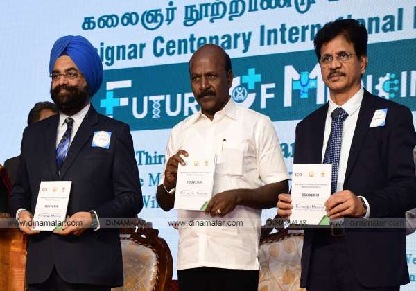 சென்னை நந்தம்பாக்கம் வர்த்தகமையத்தில் மருத்துவம் மற்றும் மக்கள் நல்வாழ்வுதுறை மற்றும் தமிழ்நாடு டாக்டர் எம்.ஜி.ஆர்.மருத்துவ பல்கலை கழகம் இணைந்து நனத்தும் மருத்துவத்தின் எதிர்காலம் குறித்த கருணாநிதி நூற்றாண்டு பன்னாட்டு மருத்துவ மாநாட்டை தொடங்கி வைத்து விழா மலரை வெளியிட்ட மக்கள் நல்வாழ்வு துறை அமைச்சர் மா.சுப்பிரமணியன் .உடன் ( இடது )மக்கள் நல்வாழ்துறை அரசு கூடுதல் தலைமை செயலாளர் ககன்தீப் சிங் பேடி , எம்.ஜி.ஆர்.,மருத்துவ பல்கலைகழக துணை வேந்தர் நாராயணசாமி .
