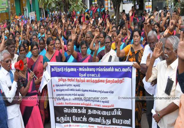 தேனி பழைய பஸ் ஸ்டாண்ட் முன் தமிழக சத்துணவு - அங்கன்வாடி சங்கங்களின் கூட்டமைப்பினர், கோரிக்கைகளை வலியுறுத்தி ஊர்வலமாக வந்து ஆர்ப்பாட்டத்தில் ஈடுபட்டனர்.