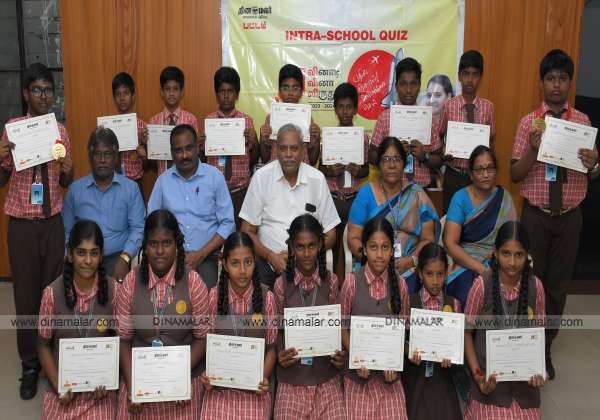 தினமலர் நாளிதழ் மாணவர் பதிப்பான பட்டம் இதழ் சார்பில் தேனி கம்மவார் சங்கம் மெட்ரிக் பள்ளியில் நடந்த வினாடி வினா போட்டியில் வெற்றி பெற்ற மாணவர்களுடன் இடமிருந்து பட்டம் ஒருங்கிணைப்பாளர் இளங்கோவன், பள்ளி துணை முதல்வர் ராம்குமார், தாளாளர் சீனிவாசன், முதல்வர் மீனாகுமாரி, பட்டம் ஒருங்கிணைப்பாளர் சத்யபாமா.