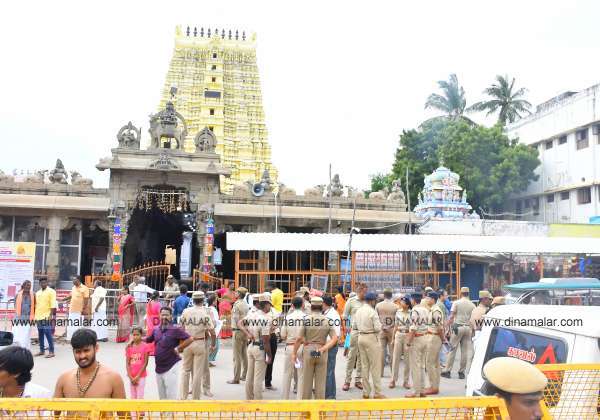 ராமேஸ்வரம் ராமநாதசுவாமி கோயில் கிழக்கு ரத வீதியில் போலீஸ் உயர்அதிகாரிகள் பாதுகாப்பு குறித்து ஆய்வு செய்தனர்
