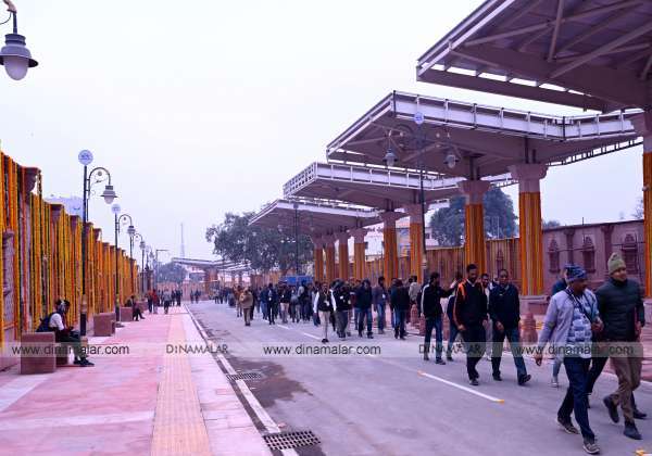 அயோத்தி ராமர் கோயில் கும்பாபிஷேகம் நடக்க உள்ளதை ஒட்டி கோயிலுக்கு செல்லும் பிரதமர் சாலையில் மலர் அலங்காரம் செய்யப்பட்டு வருகின்றனர்