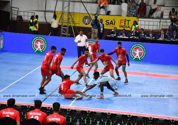 கேலோ இந்தியா கபடி அரையிறுதி போட்டியில் மோதிய தமிழகம் மற்றும் ராஜஸ்தான் அணிகள். இடம் : நேரு உள்விளையாட்டு அரங்கம், சென்னை