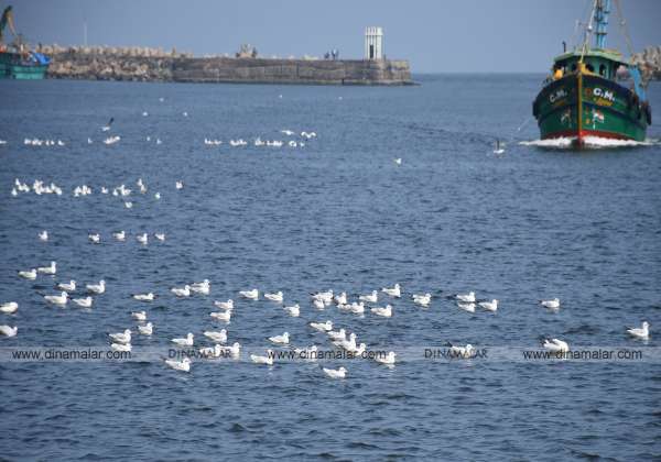 சென்னை காசிமேடு கடற்கரையில் சுற்றி திரியும் கடல்புறாகள்.