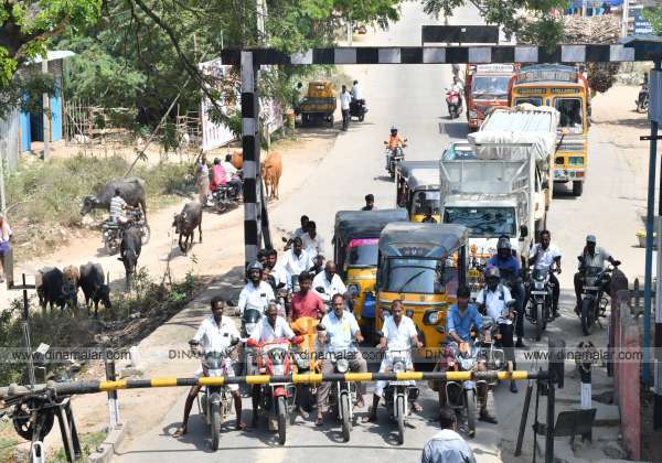 ஆந்திரா மாநிலம் ஏகாம்பரகுப்பத்திலிருந்து பள்ளிப்பட்டு செல்லும் சாலையில் ரயில் பாதையில் மேம்பாலம் இல்லாததால் நீண்ட வரிசையில் நிற்கும் வாகனங்கள்