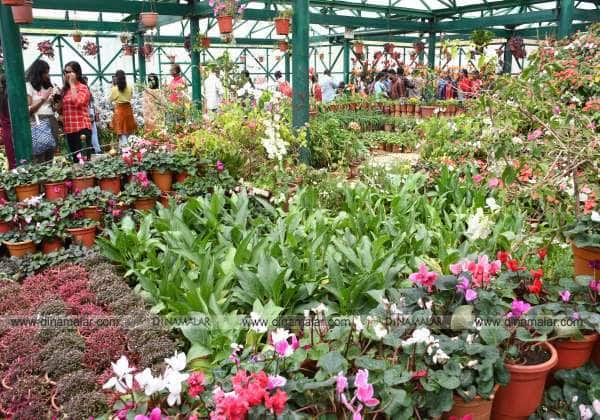 ஊட்டி தாவரவியல் பூங்காவிலுள்ள, கண்ணாடி மாளிகையில் பூக்களை ரசித்து செல்லும் சுற்றுலா பயணிகள்.
