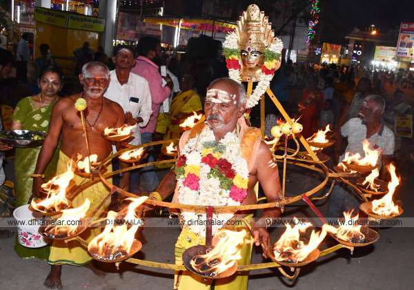 மாசித் திருவிழாவை முன்னிட்டு திண்டுக்கல் கோட்டைமாரியம்மன் கோயிலுக்கு உடலில் 51 அக்னி சட்டிகள் கட்டி நேர்த்திக்கடன் செலுத்திய பக்தர்.