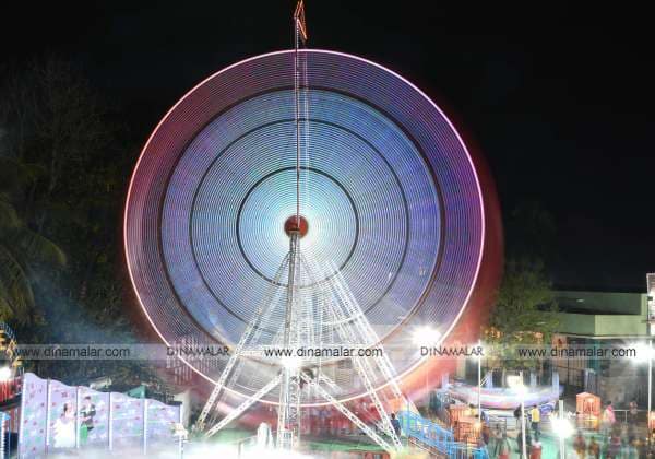 வட்டமிட்டுச் சூழலும் வண்ணப் பாதகையோ நெசவாளர்களின் கைராட்டையோ என எண்ண வேண்டாம். திண்டுக்கல் கோட்டைமாரியம்மன் கோயில் மாசித் திருவிழாவில் அமைத்த ராட்டினத்தின் சுழற்சி வேகம்தான் கேமரா கண்களுக்கு இப்படி விருந்தளிக்கிறது.
