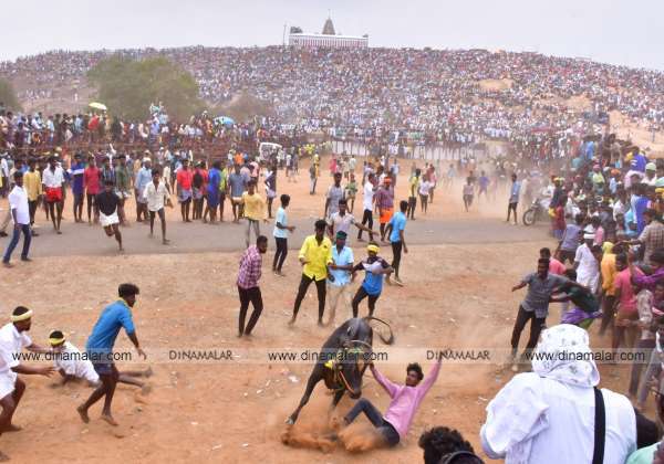சிவகங்கை மாவட்டம் அரளிப்பாறை பால தண்டாயுதபாணி கோயிலில் மாசி திருவிழாவை நடத்த மஞ்சுவிரட்டில் சீறிப்பாய்ந்த காளை.