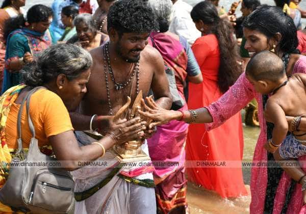 மாசி மகத்தை முன்னிட்டு மெரினா கடற்கரையில் நடைபெற்ற தீர்த்தவாரி விழாவில் பல்வேறு பகுதிகளில் இருந்து கொண்டுவரப்பட்ட சாமி சிலைகளுக்கு பூஜை நடைபெற்றது இதில் கலந்துகொண்ட பக்தர்கள்.