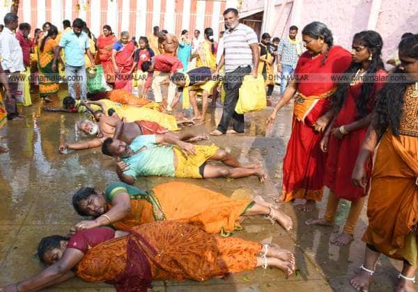 மாசி திருவிழாவை முன்னிட்டு திண்டுக்கல் கோட்டைமாரியம்மன் கோயிலில் அங்கப்பிரதட்சணம் செய்த பக்தர்கள்.