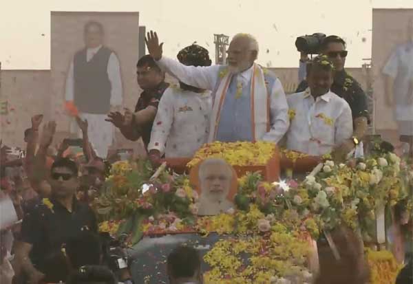 திருப்பூர் பல்லடத்தில் என் மண் என் மக்கள் யாத்திரை நிறைவு விழாவில், பங்கேற்க வந்த பிரதமர் மோடியை பா.ஜ.,வினர் மலர் தூவி வரவேற்றனர்.