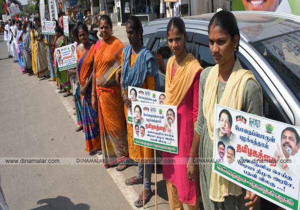 போதை பொருள் விற்பனையை தடை செய்யக்கோரியும், தி.மு.க., அரசை கண்டித்தும் தேனியில் அ.தி.மு.க., சார்பில் மனித சங்கிலி போராட்டம் நடந்தது.