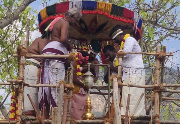 திருவண்ணாமலை இரட்டை காளியம்மன் கோயிலில் நடந்த கும்பாபிஷேக விழாவில் கோபுர கலசத்திற்கு புனித நீர் ஊற்றிய குருக்கள்.