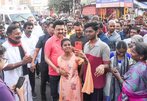 சேலம் கடைவீதி பகுதியில் திமுக வேட்பாளர் செல்வ கணபதி ஆதரித்து பொதுமக்களிடம் ஓட்டு கேட்டு நடை பயணம் செய்த முதல்வர் ஸ்டாலின்.