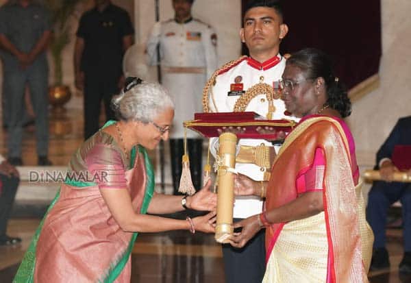 மறைந்த வேளாண் விஞ்ஞானி எம்.எஸ்.சுவாமிநாதனுக்கு அறிவிக்கப்பட்ட பாரதரத்னா விருதை அவரது மகள் நித்யாராவ், ஜனாதிபதி திரவுபதி முர்முவிடம் பெற்று கொண்டார்.