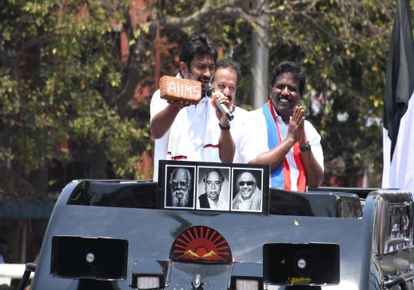விழுப்புரம் லோக்சபா தொகுதி வி.சி., கட்சி வேட்பாளர் ரவிக்குமாரை ஆதரித்து அமைச்சர் உதயநிதி ஸ்டாலின் பேசினார். அருகில் அமைச்சர் பொன்முடி.