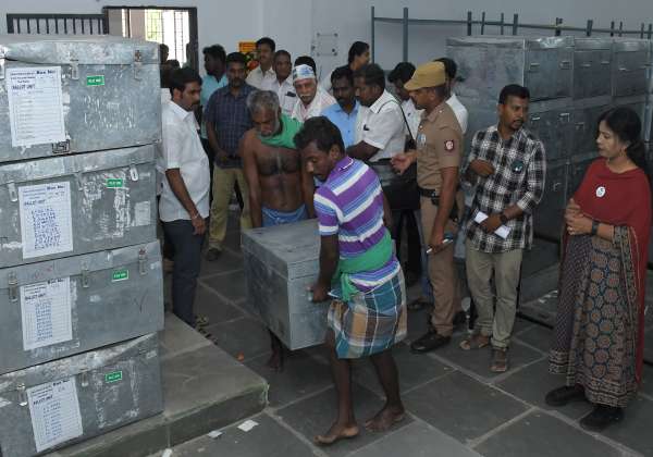லோக்சபா தேர்தலை முன்னிட்டு விருதுநகர் மாவட்டத்தில் இருந்து கொண்டு வரப்பட்ட ஓட்டுப்பதிவு இயந்திரங்கள் தேர்தல் அலுவலர் ஷஜீவனா தலைமையில் தேனி கலெக்டர் அலுவலக வளாகத்தில் உள்ள மின்னனு ஓட்டுப்பதிவு இயந்திரங்கள் வைப்பு அறையில் வைக்கப்பட்டது