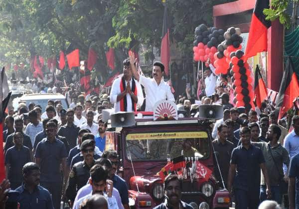 வடசென்னை தி.மு.க வேட்பாளர் கலாநிதிக்கு ஆதரவாக ரோடு ஷோவில் ஓட்டு சேகரித்த முதல்வர் ஸ்டாலின். இடம் : கொளத்தூர்