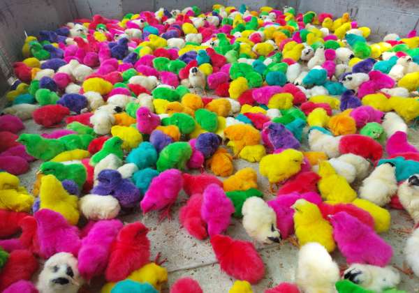 தேனியில் இருந்து திண்டுக்கல்லுக்கு விற்பனைக்கு வந்துள்ள கலர் கோழிக்குஞ்சுகள்.