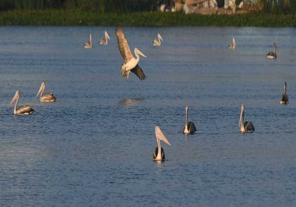 கல்லுக்குட்டை ஏரியில் மாலை வேளையில் இரை தேடி கூட்டமாக குவிந்துள்ள கூழைக்கிடா பறவைகள் இடம் : பெருங்குடி.