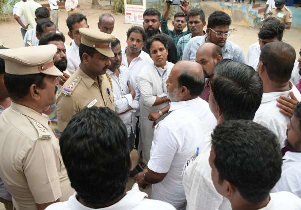 கட்சி சார்ந்த நபரின் பெயர், வாக்காளர் பட்டியலில் பெயர் நீக்கம் செய்யப்பட்டுள்ளதாக, அதிகாரிகளிடம் வாக்குவாதத்தில் ஈடுபட்ட முன்னாள் எம்.எல். ஏ. குணசேகரன் உள்ளிட்ட கட்சியினர்.