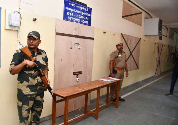 சென்னை நுங்கம்பாக்கம் லயோலா கல்லூரியில் உள்ள மின்னணு வாக்குப்பதிவு இயந்திரங்கள் உள்ள பாதுகாப்பு அறை சீல் வைக்கப்பட்டு, போலீஸ் பாதுகாப்பு போடப்பட்டுள்ளது