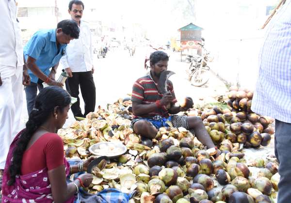 வெயிலின் தாக்கத்தை தணிக்க விழுப்புரம் புதுச்சேரி சாலையில் நுங்கு விற்பனை விறுவிறுப்பாக நடந்தது.