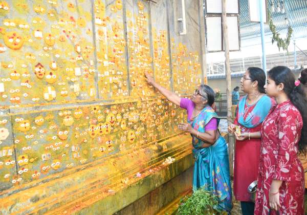உடுமலை மாரியம்மன் கோவில் தேர் திருவிழாவையொட்டி கண்மலர் நேர்த்திக்கடன் செலுத்தும் பக்தர்கள் .