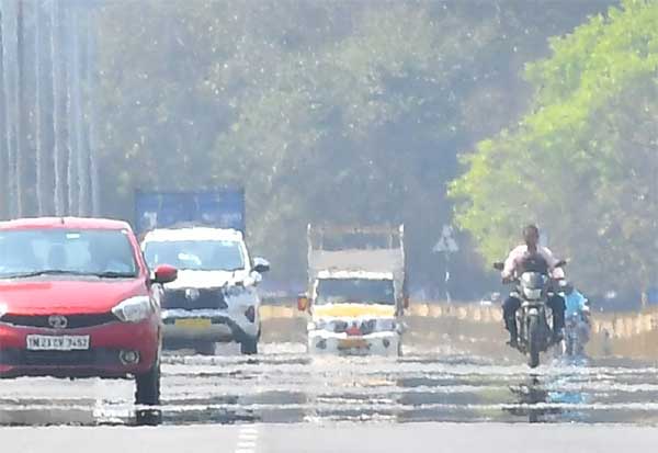 வேலூர் அடுத்த சதுப்பேரி தேசிய நெடுஞ்சாலை பகுதியில் வெப்ப அலையுடன் சாலையில் தோன்றிய கானல் நீரில் கடந்து செல்லும் வாகன ஓட்டிகள்.