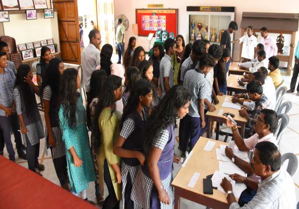 விழுப்புரம் ஸ்ரீ ஜெயேந்திர சரஸ்வதி பள்ளியில் தினமலர் டைம் நிறுவனம் இணைந்து நடத்திய நீட் மாதிரி தேர்வில் பங்கேற்க வந்த மாணவர்களுக்கு ஹால்டிக்கெட் வழங்கப்பட்டது.