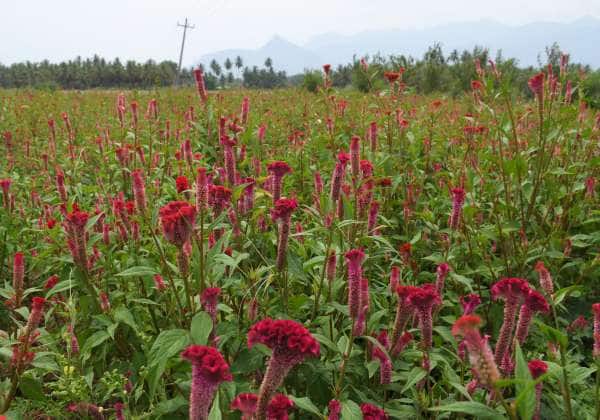 தேனி அருகே வயல்பட்டியில் பூத்துக்குலுங்கும் கோழிக்கொண்டை பூக்கள்.