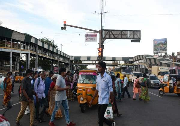 தாம்பரம் ஜி.எஸ்.டி. சாலையில் உள்ள சிக்னல் பாதையை கடக்கும் மக்கள்.