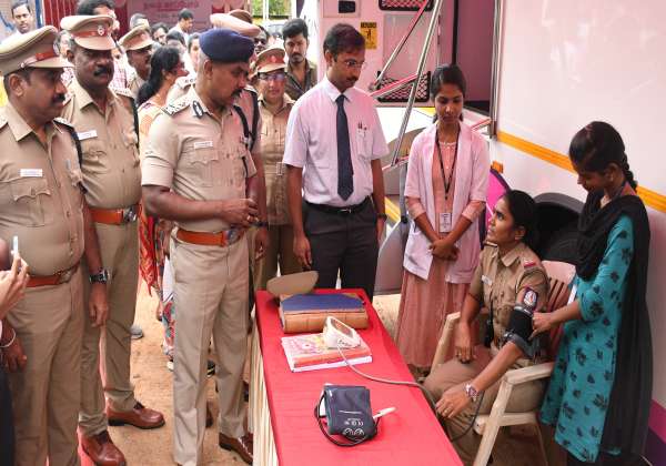கோவை பி.ஆர்.எஸ்., வளாகத்தில் கோவை மாநகர காவல்துறையில் பணியாற்றும் காவலர் மற்றும் காவலர் குடும்பத்தினருக்கு மார்பக புற்றுநோய் மற்றும் சர்க்கரை நோய், பாத பராமரிப்பு இலவச மருத்துவ பரிசோதனை முகாமை பார்வையிட்ட போலீஸ் கமிஷனர் பாலகிருஷ்ணன்.