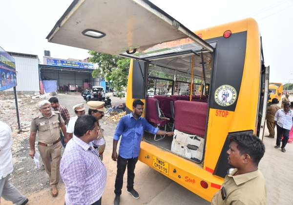 கோடை விடுமுறை முடிந்து பள்ளிகள் திறக்கப்பட உள்ள நிலையில், வாகனங்களை சோதனை செய்த போக்குவரத்து துறை அதிகாரிகள். இடம்: கொளத்தூர், சென்னை