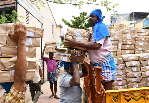 மாணவிகளுக்கு வழங்க இலவச பாட புத்தகங்களை வாகனம் மூலம் அனுப்பும் பணியில்