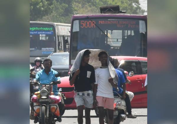 தலையில் துண்டை வைத்து தங்களை வெயிலில் இருந்து தற்காத்துக் கொள்ளும் இளைஞர்கள்.இடம்: வண்டலூர்.