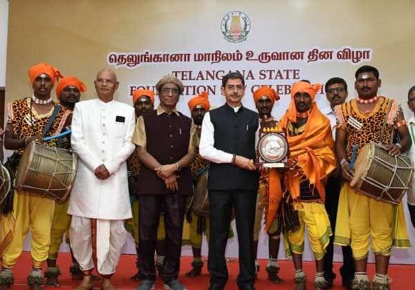 தெலுங்கானா மாநிலம் உருவான தின விழா கவர்னர் மாளிகையில் நடந்தது இதில் பங்கேற்று நடன நிகழ்ச்சியை நிகழ்த்திய நடன கலைஞர்களுக்கு நினைவு பரிசினை கவர்னர் ரவி வழங்கினார் உடன் இடமிருந்து ஶ்ரீ கலா சுதா தெலுங்கு அசோசியேஷன் தலைவர் பெத்தி ரெட்டி ஶ்ரீநிவாஸ் மற்றும் அகில இந்திய தெலுங்கு அமைப்பின் தலைவர் சி.எம்.கே ரெட்டி.இடம் : கிண்டி.