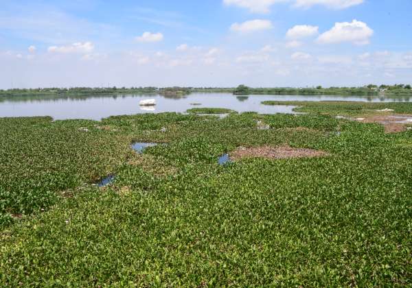 பறவைகள் சரணாலயமாக அறிவிக்கப்பட்ட திருப்பூர் நஞ்சராயன் குளத்தில், ஆகாய தாமரைகள் படர்ந்துள்ளது.