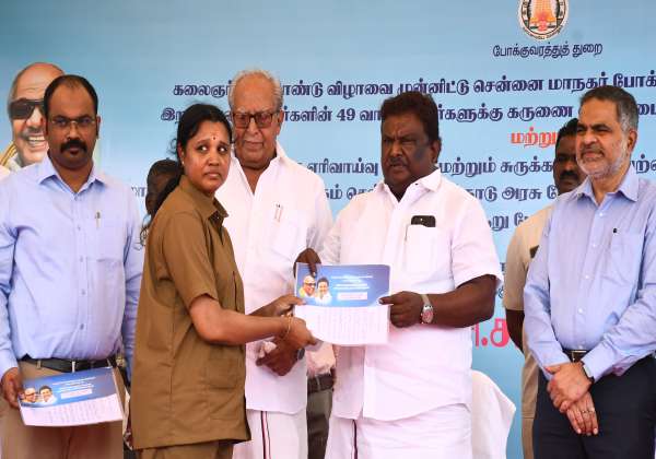 மாநகர போக்குவரத்து கழகத்தில் பணிக்காலத்தில் இறந்த பணியாளர்களின் 49 வாரிசு தாரர்களுக்கு கருணை அடிப்படையில் அமைச்சர் சிவசங்கர் பணி நியமன ஆணையை வழங்கினார். உடன் இடமிருந்து மாநகர போக்குவரத்து கழக நிர்வாக இயக்குனர் ஆல்பி ஜான் வர்கீஸ், எம்.பி., சண்முகம், போக்குவரத்து துறை செயலர் பணீந்திர ரெட்டி, ஆகியோர்.