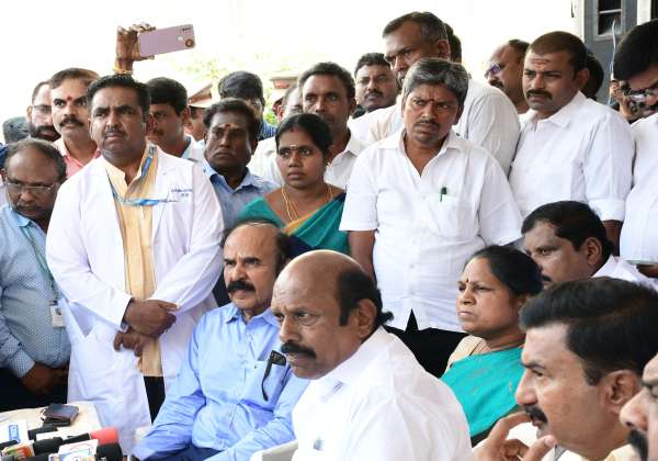திருப்பூர் மருத்துவக் கல்லூரி மருத்துவமனை வளாகத்தில், நமக்கு நாமே திட்டத்தில் புற்றுநோய் சிகிச்சை மையம் கட்டும் பணி நடந்தது வருகிறது. அதை அமைச்சர்கள் ஏ வ வேலு, சாமிநாதன், கயல்விழி ஆகியோர் ஆய்வு செய்தனர். அப்போது கட்சியினர் அனைத்து சேர்களிலும் அமர்ந்ததால், கூட்டம் முடியும் வரை, மருத்துவ கல்லூரி டீன் கூட்டத்தோடு கூட்டமாக நின்று கொண்டிருந்தார்.